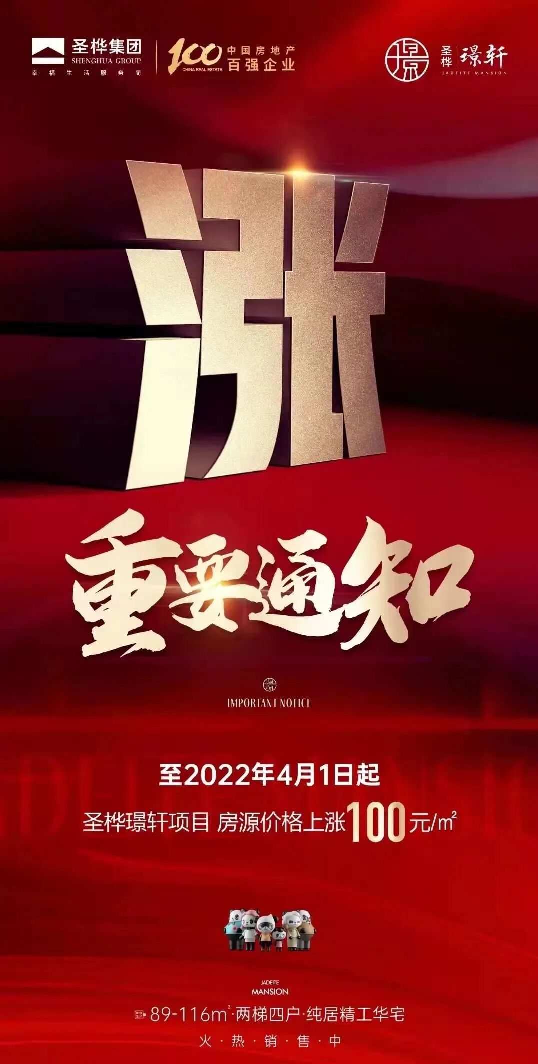 比起南海区的涨幅,其他区的盘涨幅相对较小,以2-3%为主。其中,禅城美的时光上周末已加推最后2栋南向大户型望江产品,4月1日起价格再上调2%。北滘旭辉雅居乐清樾、金地熙悦称4月1日起全线产品涨价2%;杏坛顺德自在城直接宣布一季度指标提前完成,从3月28日起在售房源全线涨价3%。值得一提的是,全市涨幅最低的楼盘,圣桦景轩宣布涨100元/平。