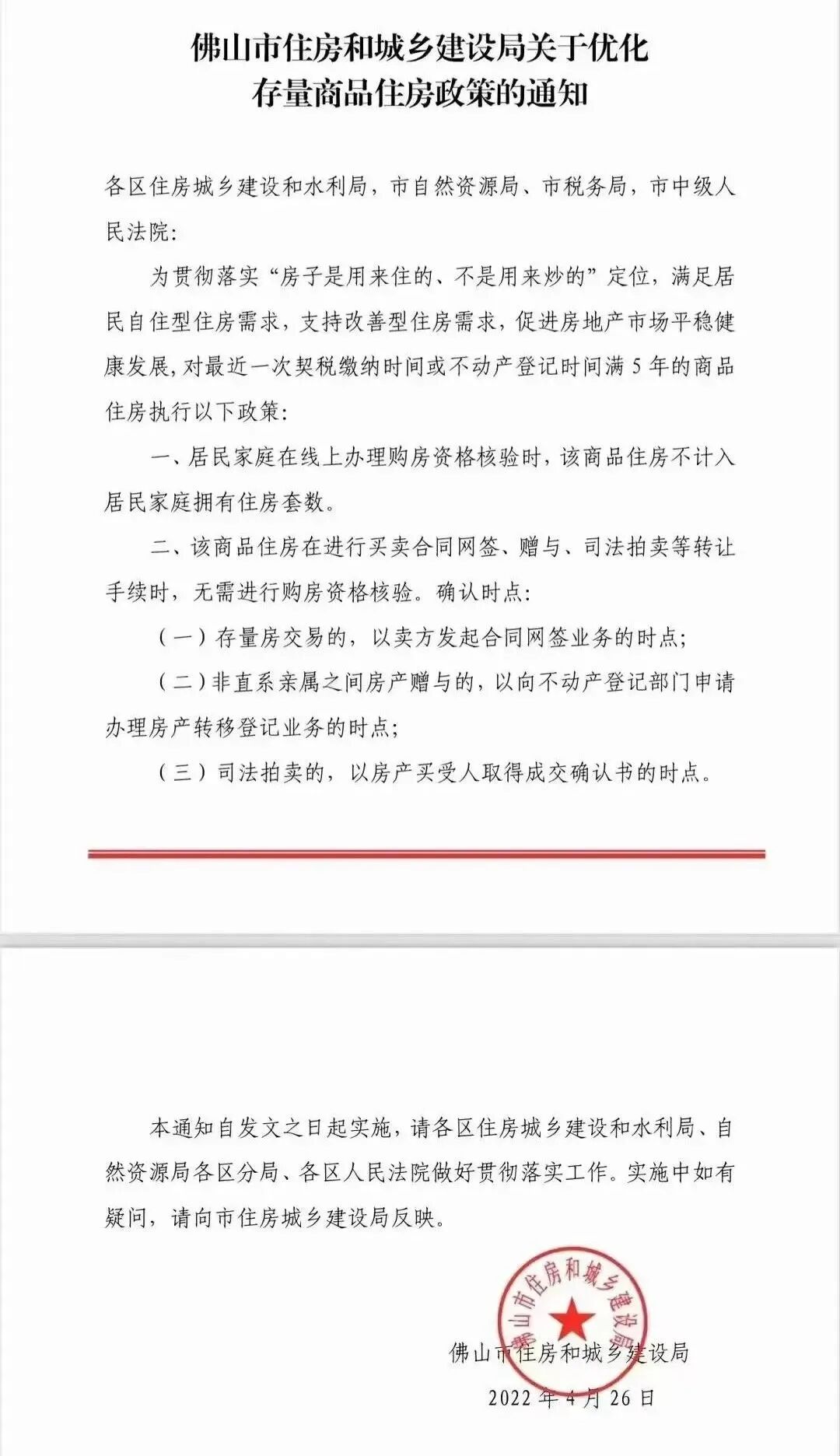 4月26日,《佛山市住房和城乡建设局关于优化存量商品住房政策的通知》提到: