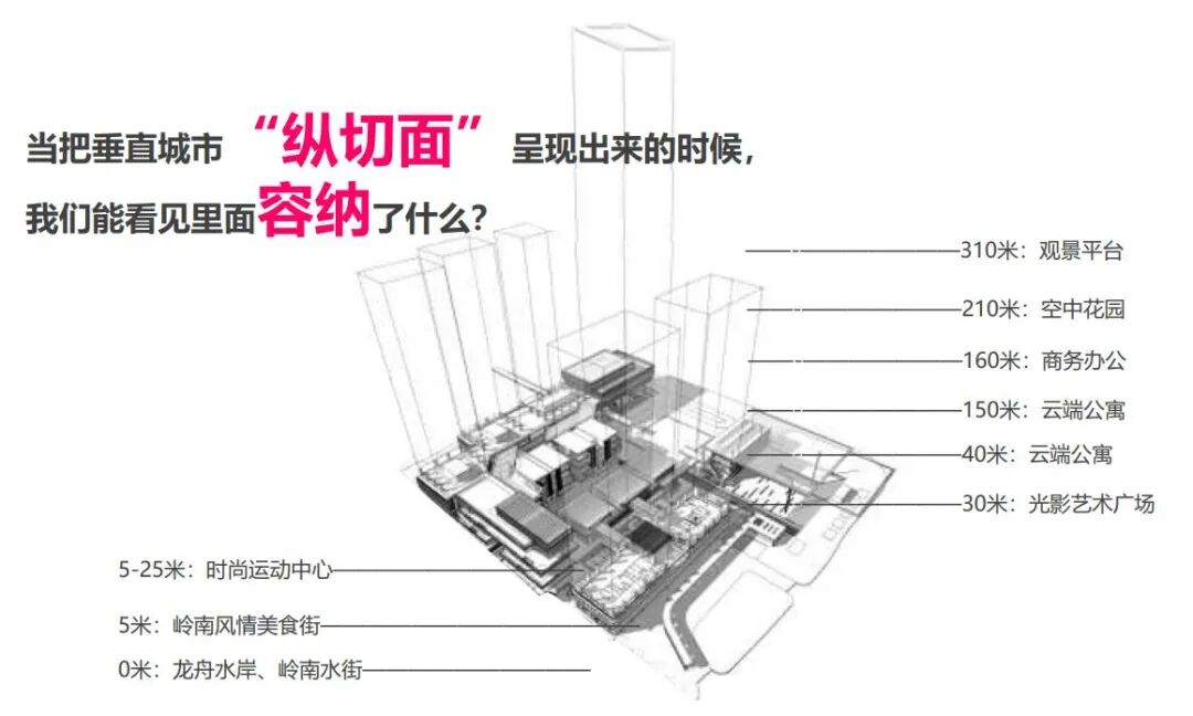 这座“超级生态体”,融汇了约350米摩天写字楼、云端公寓、国际商业中心、艺术体育中心等顶级业态和生活资源,将垂直复合的功能发挥到了极致。不重复过往,只创造伟大。保利天悦将引领佛山与同步世界的生活方式:创新设计约210米空中花园、约310米观景平台,刷新的不止是佛山的高度,更是世界的生活高度。云端传奇公寓,汇聚新势力塔尖圈层,缔造城市向上力。公寓由国际顶尖酒店设计公司CCD打造,涵盖约62-188平产品。董事长亲自执笔,以前瞻性的眼光,锻造超前未来5-10年臻品,为佛山影响力人物带来超越所享的生活方式。约5.3万平商业中心,一半世界生活想象,一半岭南时光风情。这里将吸纳众多国际潮牌、高端餐饮、时尚文化等品牌进驻,将形成独特的街区式消费体验。想象一下,在佛山保利天悦垂直城市,就能遇见属于粤港澳大湾区的“太古里”,全球各地的名流都前来打卡,让这座城市散发出不一样的大都会气质。约2.5万平社区运动中心、约1万平艺术体育中心,涵盖空中篮球场、国际标准泳池、羽毛球场、乒乓球馆......这里是生活场,更是社交场。准确来说,这座垂直城市不仅是佛山未来价值符号,更是为阅遍大千世界的塔尖人士而生。其丰富的内涵,是如何融于建筑之中,又将给塔尖人士带来什么样的生活改变?我们不妨从垂直维度切开来看。约350米的垂直高度,呈现在眼前的是人文休闲、奢雅生活、超级都会三座城市形态,分别诉说着过去、现在与未来的故事。高度约-15~30米,打开第一座城市,一座人文休闲之城映入眼帘。