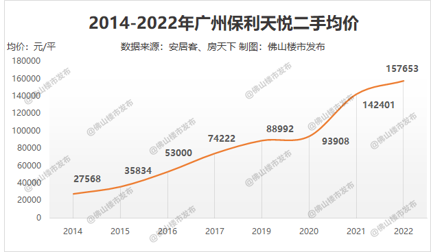 据安居客、房天下等数据显示,从2014年到现在,广州保利天悦的二手均价从“2字头”跃升至15万/平,身价翻了5倍,8年间,天悦的业主几乎能实现“财富自由”。