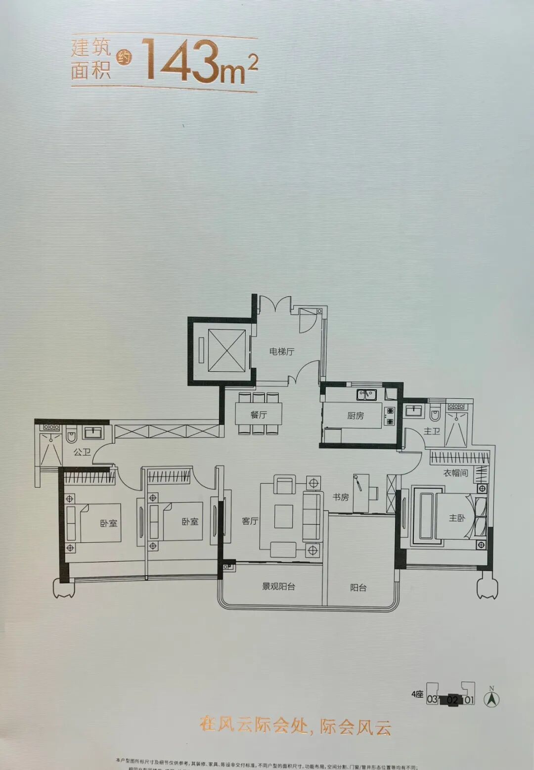 建面约142平的四房,是4座01户型,采用经典大横厅设计,餐客一体,带同宽度景观飘窗,与阳台组成270°超大景观阳台,空间采光更通透。