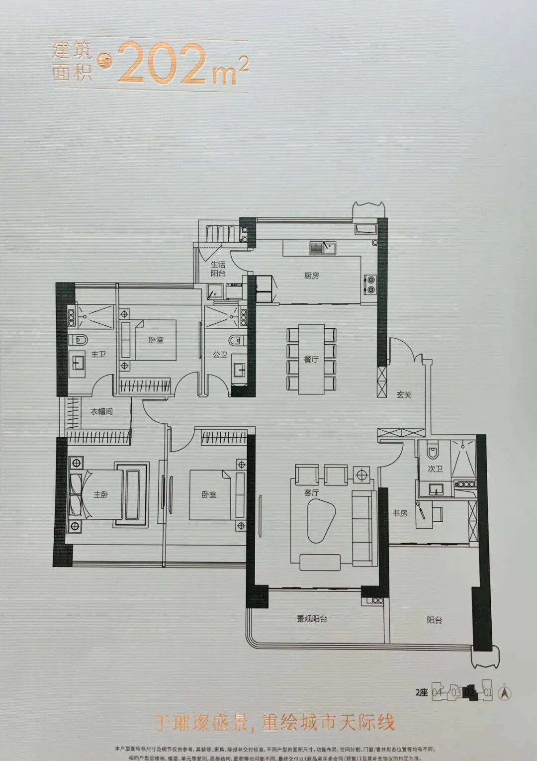 建面202平的四房,为2座02户型,双套房设计,其中书房套间连着大阳台,空间可自由改造。整体功能分区明显,居住舒适性较高。