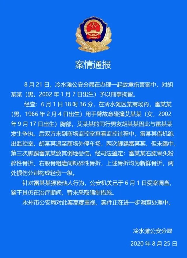 2020年6月6日,菱角山派出所民警打电话给小胡说,袭胸男子在事发当天摔倒后受伤了,现在正在永州市中医院住院治疗。2020年6月10日,听说男子要做手术,小胡的爸爸妈妈便前去交了10000元的手术费,医生说袭胸男子不久前就受过伤,骨头更容易受伤。派出所民警说,如果这次雷荣元经鉴定构成轻伤,小胡就要坐牢。