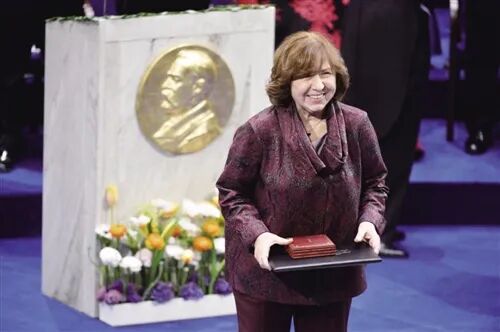 2015年10月8日,瑞典学院将2015年度诺贝尔文学奖颁给了阿列克谢耶维奇,以表彰她对这个时代苦难与勇气的写作,他们这样评价她的作品:多种声音的作品,一座记录我们时代的苦难和勇气的纪念碑。