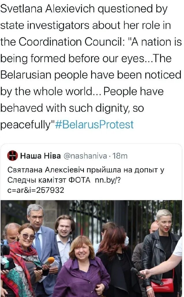 ”我们亲眼目睹一个国家正在我们面前诞生,它诞生在街头上。现在整个世界都听到了白俄罗斯的声音。”