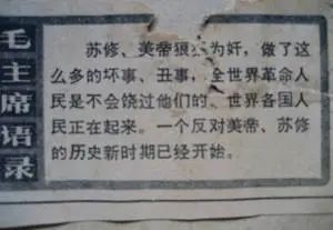 语录满天下:从县城到小乡村的墙上,到处用白灰制成白壁,用红油漆写上毛语录。家家户户的大门口,都由大队出钱,用白灰制作成对联、横披,然后请小学教师用红油漆写上毛语录。从小学到中学读的就是毛语录。文件、信封、信纸上面,第一行都是印着毛语录。