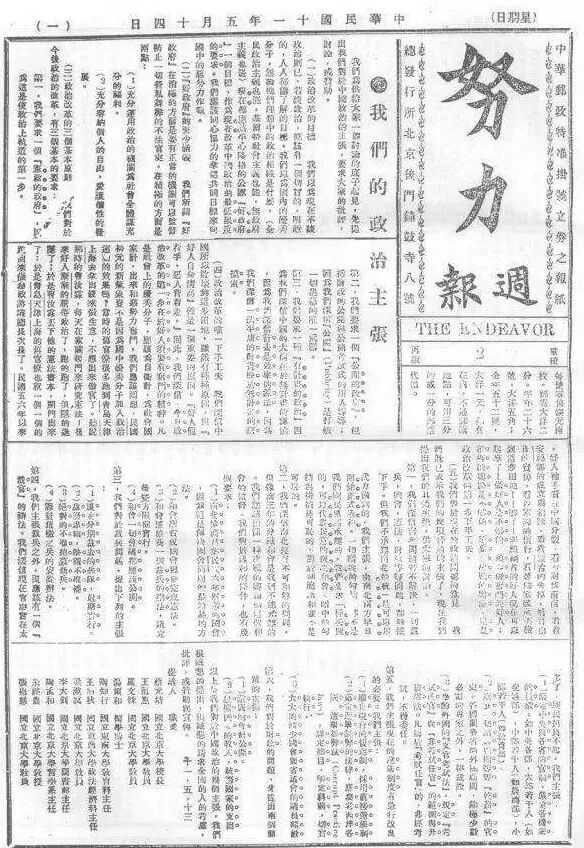胡适等:《我们的政治主张》发表于《努力周报》第2期,1922年5月14日