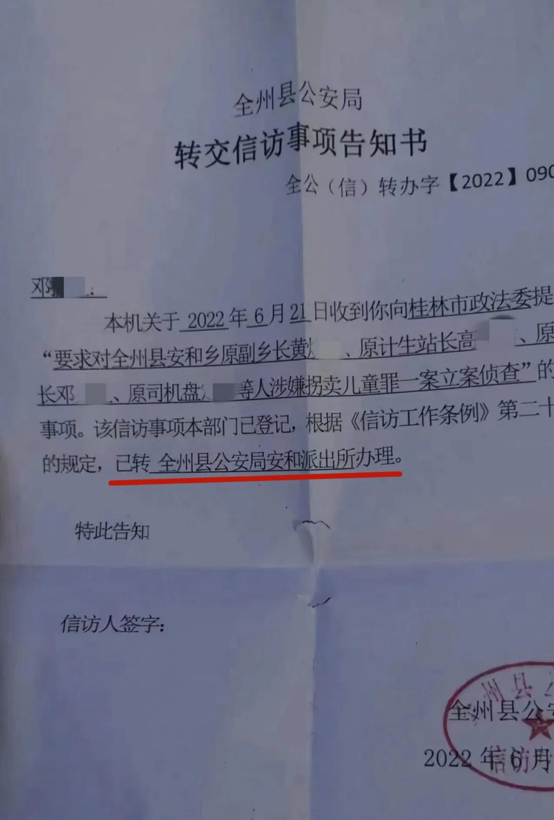 随后,一份落款为全州县公安局的《全州县公安局转交信访事项告知书》在网上流传,其中提到,关于2022年6月21日收到邓某某向桂林市政法委提出“要求对全州县安和乡原副乡长黄某某、原计生站站长高某某等人涉嫌拐卖儿童罪一案立案侦查”的事项,信访部门已登记,并依例转全州县公安局安和派出所办理。7月5日上午,新京报记者尝试联系相关当事人邓某某夫妇,语音提示对方已关机。记者随后多次拨打全州县卫生健康局电话,显示正在通话中或无人接听;桂林市卫健委一名工作人员表示“正在对事件进行调查”。7月5日中午,新京报记者致电安和派出所,接线工作人员表示,《全州县公安局转交信访事项告知书》中提到的案件已立案,“毕竟已经过去很久了,我们要侦查,肯定要先调查取证。”该工作人员还表示,他不是这起案件的办案民警,不太清楚具体立案案由,并称“是上周接到上级公安机关反馈下来立案的”。下午1时许,记者再次致电安和派出所,接线工作人员表示,“(案件)我们正在调查中,还没出结果。”新京报记者联系全州县委宣传部,一名工作人员表示,正在核实该事件的具体情况,后续情况以官方通报为准。━━━━━