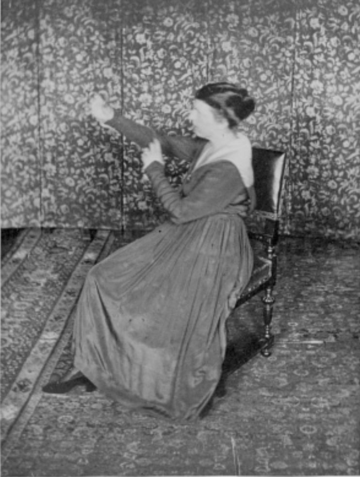 那么,格鲁瑙的课堂看起来是怎样的呢?她最重要的工具是她的大钢琴。她的崇拜者,来自耶拿的出版总监尤金·迪德里希斯[Eugen Diedrichs],在他1920年5月号的《Die Tat》杂志中这样向他的读者描述一次小组课程:“一个人闭上眼睛,然后伴随着短期的内心释放[inner closure]。接下来的指令是去想象一个彩色的球,去感受它,用手指去戳它,或想象在钢琴上敲出一个音符。很快地,几乎所有在场的人都动了起来。…一个青年站起来,一只手臂用力在空中击打着另一只,仿佛他正在建筑工地向上扛石板,而他的脚以一种舞蹈的节奏有力的在地上滑动。…另一个人…完全惊讶于一个女孩的手语表达中。”1980年,年过90岁的包豪斯织工、从前的学生艾尔丝·莫格林[Else Mögelin]在访谈中回忆起课堂上的微妙时刻,
