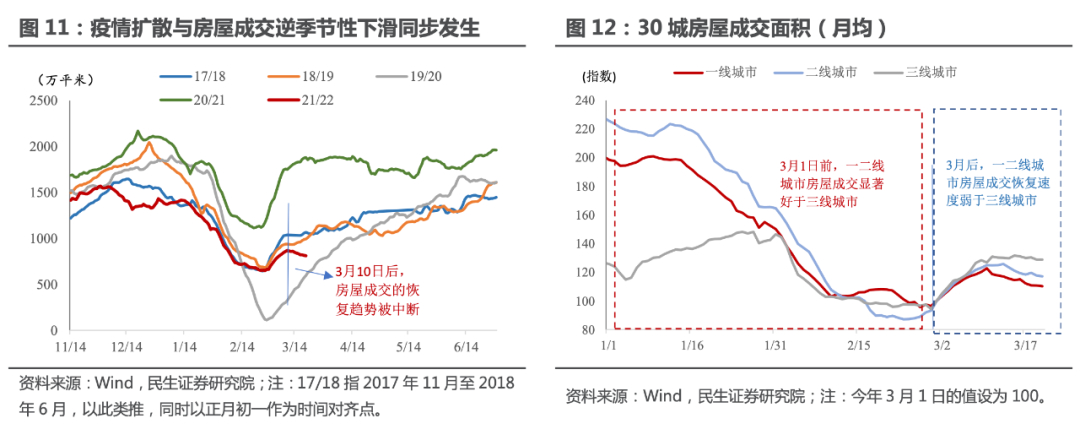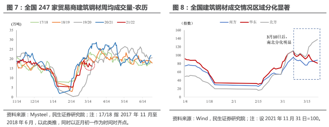 然而和网上盛传的情况不同,其实港口物流目前受到的影响并没有那么大。去年5月盐田港曾因疫情暂停,但今年各港口仍在正常作业,只是船舶等待时间有所延长。根据彭博数据,青岛港等待船只从3月初的41艘增加到3月14日的72艘,上海、宁波和舟山三个港口的等待船只则只是从月初的242艘增加到262艘。那么公路物流的阻断会对什么造成影响呢?基建投资以及与之相关的房地产市场是一个重要的方向。疫情对于基础设施建设的影响要比工业大,首先是因为建筑工地一般位于市区,而且工人的流动性比工厂要大,因此当有工地作业人员确诊时,政府会要求相关工地停工并排查类似情况。其次,如果物流不畅,建材物资能否及时地送至工地面临着较大的不确定性,从而对于施工节奏存在一定影响。以湖南省在2021年6-9月的投资表现为例。7月底开始疫情趋严,固定资产投资同比增速回落 5 个百分点左右,9月后疫情明显缓解,固投同比增速回暖4.5个百分点左右。而针对此波疫情,民生证券选取了全国247家贸易商的建筑钢材成交的周频数据来代表工地的施工情况。一般来说,成交越旺盛,终端需求越好。正常情况下,全国建筑钢材成交量在元宵节后逐步回暖,在4月份达到阶段性峰值。但今年3月以来,建材成交也出现反季节性下滑,相比正常的季节性水平下滑20%左右。分区域看,华东地区和南方地区的建材成交下滑幅度最明显,而北方地区疫情严峻程度弱于华东和华南,因此建材成交量仍在上行。![]()