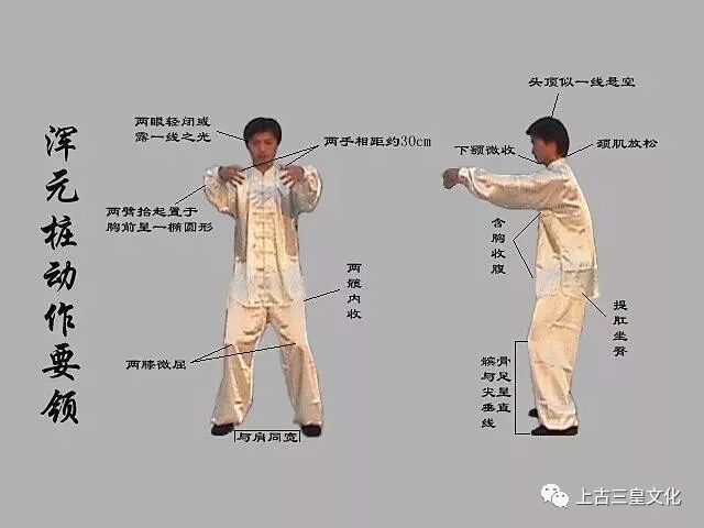 头要正,百会上领(想像头顶似有一线把头部悬吊起),下颏微收。口微微闭,舌抵上腭,神情平静。目光平视,自然呼吸,全身放松。使周身上下气机平衡、和畅。