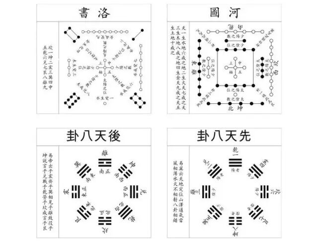 《河图》《洛书》为八卦之源。《河图》为体主常,《洛书》为用主变,“河源洛方,与河方洛圆,内外合为”河图“,相对交为”洛书“河图为加减之原,”洛书“为乘除之原,”河图“奇偶合,”洛书“奇偶分。