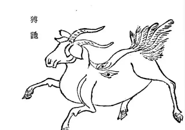 【解说】:䍶䍶(音东)是独角独目奇兽,又是兆岁丰的吉祥之兽。它的样子像羊,一角一目,目在耳后,其叫声有如呼唤自己的名字。经文中说,䍶䍶是吉兽,但也有凶兆之说。胡文焕图说:“此兽现时,主国内祸起,宫中大不祥也。”