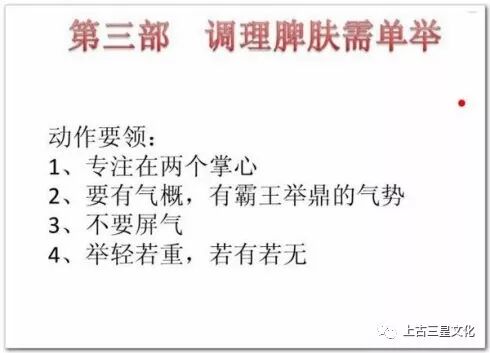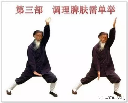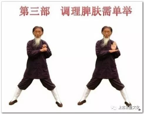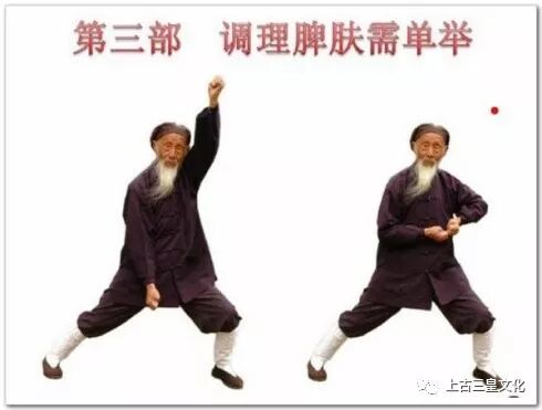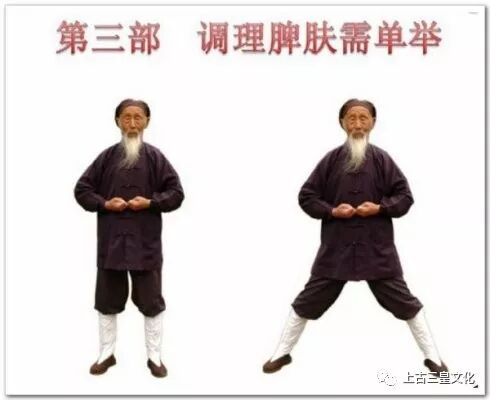 脾恶湿喜燥,胃恶燥喜湿;脾气宜升,胃气宜降。两者相辅相成,彼此协调平衡。根据此原理,本功法采取两臂上下举按的动作,使阴降阳升,不断调理脾胃气之中和。又脾有大络穴,在人体腋窝下六寸,走向皮里肤外。本功法的双臂举按开合,能疏通大络穴,调理脾肤,消除风寒湿燥、血凝等疾病。