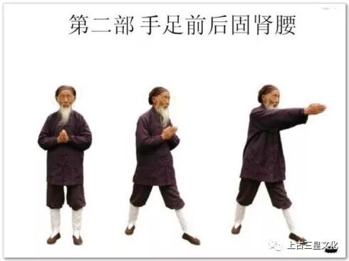 肾为先天之水,也是五脏六腑之本。主水,藏精,主纳气,生命门之火(人身元阴、元阳之气的所在),主骨生髓,同于脑。肾是主宰人体生殖、生长、发育及维护水液代谢平衡的重要脏器,是人体生命得以继续呈现的能源动力,是心肾相交、水火既济、神体共融而长存的物质基础。本部功法通过“手足前后”、弯腰、屈膝、按摩肾腰的习练以调理肾经、膀胱经,达到强肾壮腰之目的。
