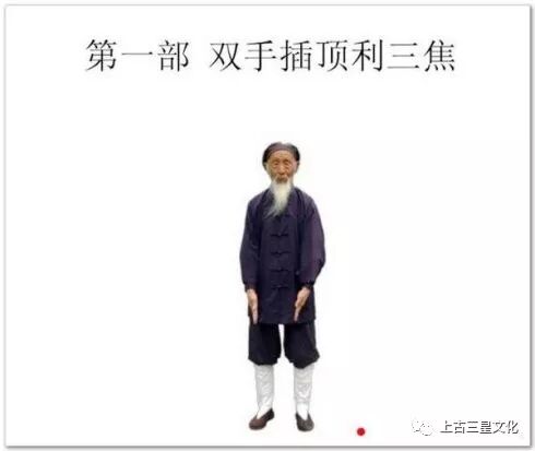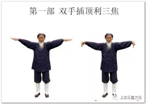 手少阳三焦经脉起于无名指端之“关冲穴”(无名指指甲外角一分处)交于足少阳胆经(丝竹空)后,与心包经相络。手腕和手指手三阴、手三阳的发源处和归宿。本部功法使全身用内劲,反掌从头顶直插云霄,牵动了手三阴、手三阳、足三阴、足三阳,任督二脉和奇经八脉,达到利三焦,就使头、五脏六腑、四肢的阴阳表里作了一次整体调整,为后面几部功打下基础。