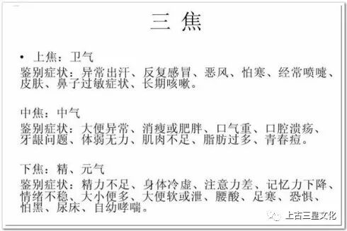 三焦是上焦、中焦、下焦的合称。从部位和有关脏腑来说,上焦是指胸隔(胃上端,针灸穴位指鸠尾穴)以上部位,包括头、咽喉、上肢、心、肺等;中焦是指胸膈以下至脐以上部位,包括肝、胆、脾、胃等内脏;下焦是指脐以下,包括腹部、腰部、膝部、下肢、肾、大肠、小肠、膀胱等(病理生理的角度而言,有时下焦还包括肝、胆)。