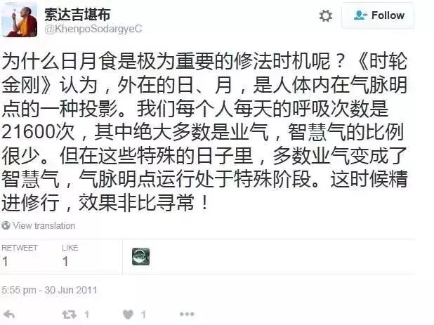 为什么日月食是极为重要的修法时机呢?《时轮金刚》认为,外在的日、月,是人体内在气脉明点的一种投影。我们每个人每天的呼吸次数是21600次,其中绝大多数是业气,智慧气的比例很少。但在这些特殊的日子里,多数业气就变成了智慧气,气脉明点运行处于特殊阶段,在这时候精进修行,其效果会非比寻常!