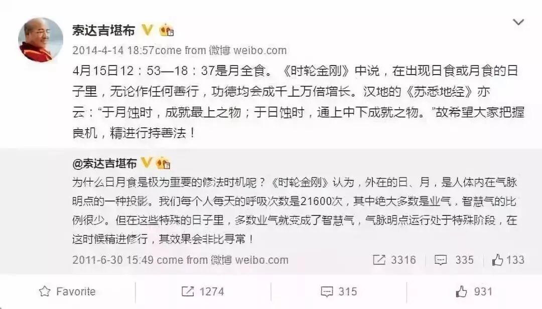 《时轮金刚》中说,在出现日食或月食的日子里,无论作任何善行,功德均会成千上万倍增长。汉地的《苏悉地经》亦云:“于月蚀时,成就最上之物;于日蚀时,通上中下成就之物。”故希望大家把握良机,精进行持善法!