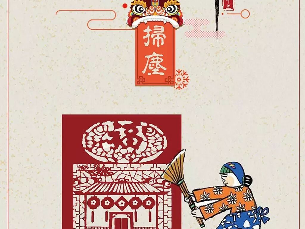后“尘”与“陈”谐音,故扫尘也就是把陈旧的东西一扫而光,这既指庭院内的陈年积垢,也指旧岁中遇到的不快。
