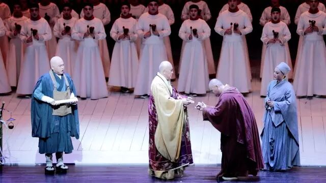 叶小文:我记得一个场面,在奈良演的那天,这个日本的观众,他是文化欣赏水平很高,歌剧两个多小时啊,安安静静地等候,到动情处,都看出他们好像饱含热泪。当鉴真唱到,他一定要,眼睛都瞎了,一定要去日本,当鉴真在日本思念故乡,当荣叡突然要去世的时候,这里几段歌啊,我在奈良听着,好像观众里面,挥泪如雨啊。外面大雨倾盆,对,撒雨如泪。非常奇特,这个演出一结束以后,突然天就晴了,老天啊,都跟着我们一起哭啊。演完以后,它也不哭了,非常地感人。那么为什么这种歌剧,刚才鲁湘说在我们中日关系还比较困难的时候,它是普遍地受到欢迎,日本的很多政要也来看,民间也都欢迎。我就想起刚才大仓那个能乐,就给人感到一种,虽然存在时空,但是跨越时空的那样一种能量,那样一种穿越,那样一种对美好,对未来的向往。而佛教交流,它就是这样,赵朴初告诉我,它存在于时空,它能跨越时空。在中日关系每当它最困难的时候,总有这些高僧,佛教的高僧,总有一股文化的力量,默默地站出来。