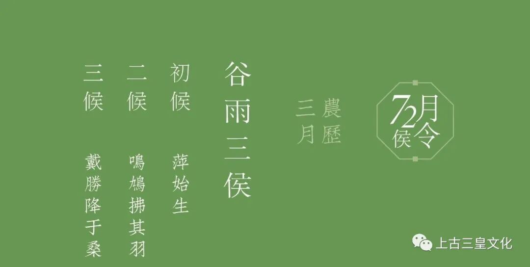 古人将谷雨分为三候:“第一候萍始生;二候呜鸠拂其羽;三候为戴任降于桑。”是说谷雨后降雨量增多,浮萍开始生长,接着布谷鸟便开始提醒人们播种了,然后是桑树上开始见到戴胜鸟。关于谷雨节的来历,据《淮南子·本经训》记载,“昔者仓颉作书,而天雨粟、鬼夜哭。”