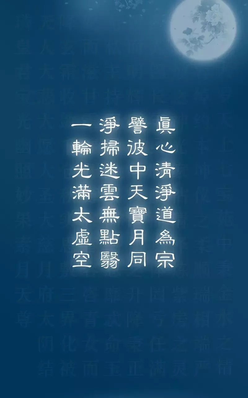 月府太阴,照澈光明,玄玄幽显,浩浩育阴,吾取真气,异之傍星,生之者吉,念之者昌,太阴帝君律令敕,愿降真气,助吾真人!月光朗朗普照乾坤,法界众生蒙恩佑,一轮映大千,性海澄清,道心永圆明!