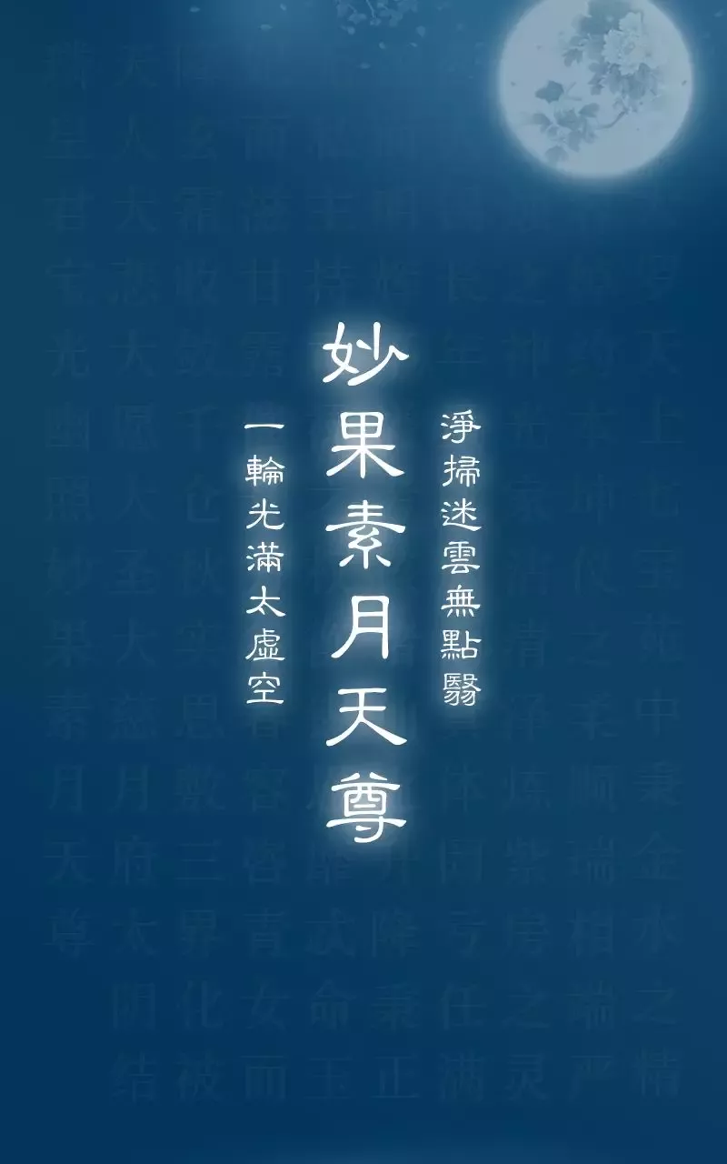 广寒至圣,紫光上真,主北极之阴关,掌人身之魄体。明分长短,致吉凶有缺有圆。显示灾祥,降祸福无差无忒。巡游不住,月碧亘古常明。辉耀无边,素魂普施大化。凡承运照,实荷生成,大悲大愿,大圣大慈,月宫太阴皇君普照大天尊。