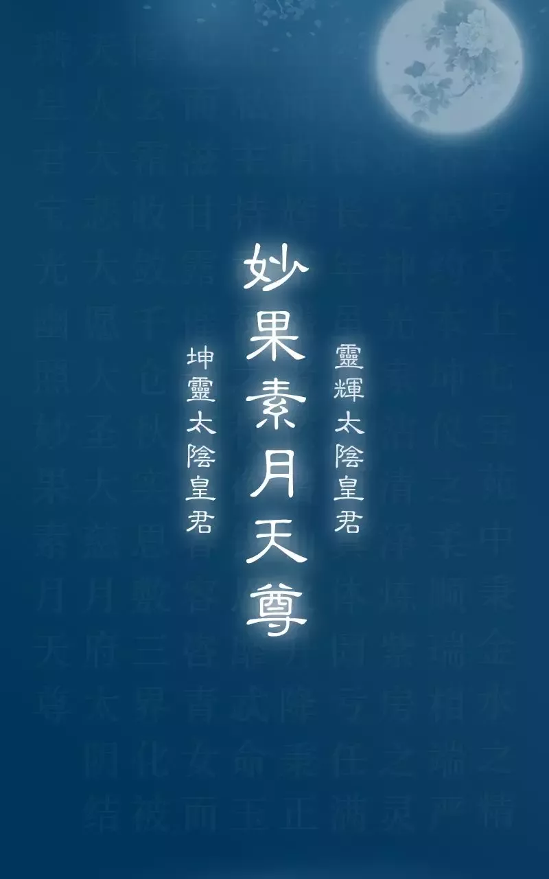 大罗天上,七宝苑中,秉金水之精华,姿容绰约本坤仪之柔顺,瑞相端严,开玉烛之神光,家沾清泽,炼紫房之灵药,人锡长年,虽朓朒而真体罔亏,任满盈而明辉不溢,考核诸仙之升降,秉正无私,主持司禄之权衡,锡恩靡忒命玉妃而滋甘露,催开万谷春容,咨青女而降玄霜,收敛千仓秋实,恩敷三界,化被天人大悲大愿,大圣大慈,月府太阴,结璘皇君,宝光幽照妙果素月天尊。
