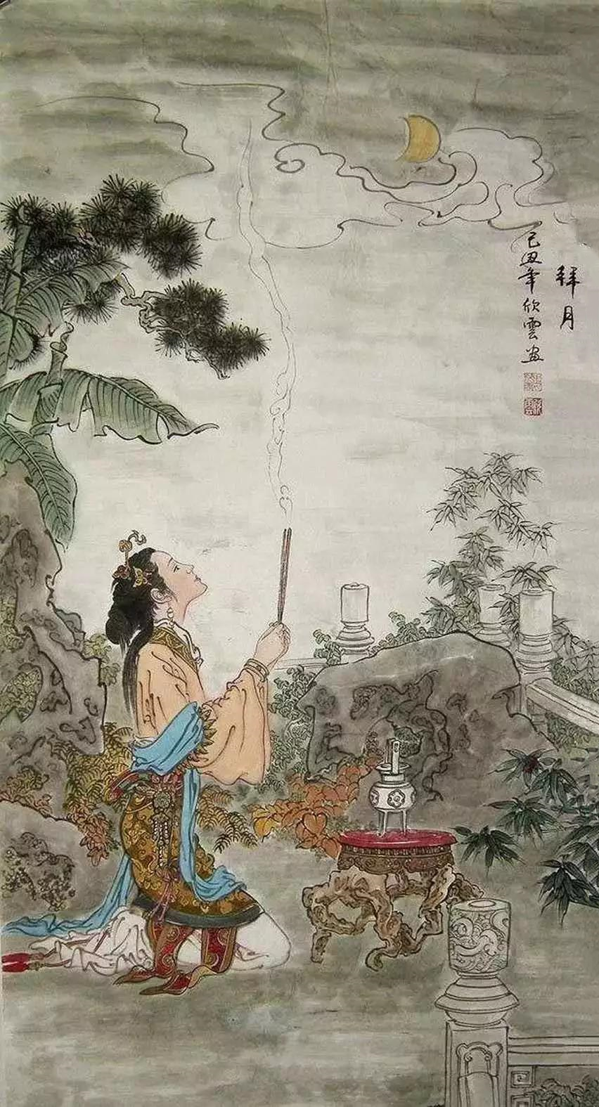 民间也把太阴星君看成嫦蛾,认为太阴星君是一位绝色美人,所以非常喜欢人人都欣赏她,也因为这个缘故,八月十五日的太阴星君诞辰祭,都在入夜以后,面对当空的皓月家家户外围院,排设香案点上一对红烛,供上四色鲜果,焚香膜拜,气氛十分虔诚,而又带有几分闲情逸致之感。在黑夜中,月亮给人带来了光亮;月色朦胧,又会使人产生许多遐想,许多美丽动人的故事因此产生,“嫦娥奔月”就是其中著名的一个。