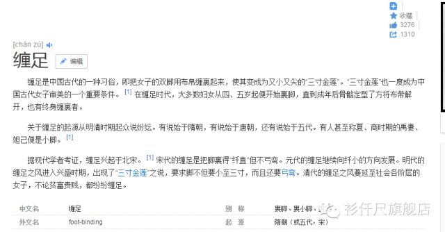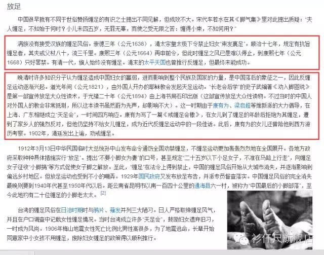 我们看到了疑点,接着上面的祖训"身体发肤,受之父母,不敢毁伤,孝之始也",然后再结合百度百科里三寸金莲词条的描述:"