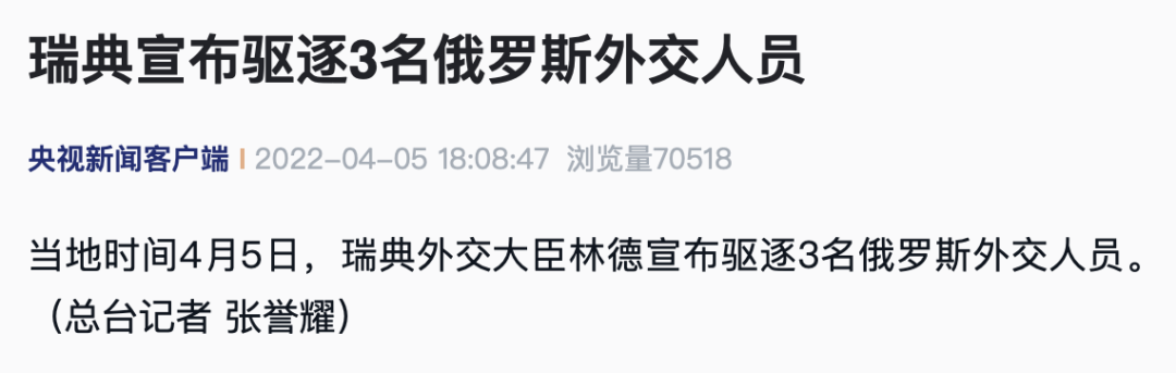 当地时间4月5日,瑞典外交大臣林德宣布驱逐3名俄罗斯外交人员。