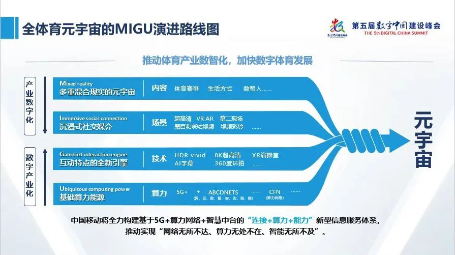 最基础的需求是生理需求,即人类作为生命个体生存的需求,而体育正是起源于远古人类获得食物时必须使用的跑、跳、爬等动作;第二层是安全需求,人类为了获得安全生息的空间,锻炼、发明了对抗野兽的技巧和工具,建立群体狩猎机制,这些战斗技能演练、活动的过程,成为众多体育竞技的雏形;第三层是社交需求,人类开始渴望情感互动的满足,而体育以一种游戏的形式,加深了人与人之间的感情。第四层是尊严需求,人们希望获得尊重,希望个人的特长能吸引别人的注意、认可和称赞,而体育发展到一定阶段后出现专门的体育竞赛表演,优秀运动员将收获雷鸣般的欢呼;最高层次是自我实现需求,每个个体完全从个人本心出发,追求成为“完美自己”,而真正的体育正是自己与自己的较量,比起精彩的体育技巧,突破自己、超越自己的体育精神,被视为体育更鼓舞人心的魅力核心。人类对于体育需求按照层级演进,时至今日每个层级的需求或许有些变化,但仍然存在。咪咕体育的焕新升级正是出于对宏观背景的洞察和需求层次的把握。从初心来看,每个个体都有追求美好生活的元动力,而“5G+全体育”能够为其赋能。焕新升级后,咪咕体育的服务更以人为本,帮助用户满足不同层次需求,为用户创造从自我实践中获得升华体育体验的机会。而这种实践升华,将促使受众成为更奋进、更健全的个体。结合体育强国、健康中国等战略,咪咕体育升级将发挥其新媒体国家队主力军、沉浸式媒体先锋队的带头作用,更全面地融入到提升国民身体素质、满足人民日益增长的美好生活需要的宏伟事业当中。如上所述,“美好生活元动力”是咪咕体育本次升级的品牌传播口号。“元动力”成为升级的核心词。从用户的需求角度而言,这可以理解为人们参与体育、体验体育的初心;通过体育运动去获取力量、得到成长的原本欲望。而从咪咕的角度而言,这体现了他们为用户赋能、帮助用户实现目标的核心能力,即以元宇宙的MIGU演进路线图为指引打造的全体育元宇宙。具体而言,咪咕也借助“美好生活元动力”这一品牌传播口号,展示出其具体的发展手段:“元”即打造“全体育元宇宙”,以“5G数字底座”做支撑,以超高清、HDR、AI等为代表的“5G黑科技”,构建视频彩铃、VR、AR等5G技术应用场景,通过体育赛事、生活方式、数智人等内容呈现,形成现实与虚拟相互融合的“平行时空”。“动”即让体育运动成为美好生活引擎。咪咕致力于打造极致体验体育故事,提供包含基础运动、身体训练、竞技体育、全民体育等等在内的丰富体育内容,让全民健身成为一种生活方式,以满足人民群众对美好生活的不断向往。“力”则是打造元宇宙、发展全民健身的底层支撑力——算力。依托中国移动的算力网络,咪咕将全面助推体育产业数智化升级。这一次焕新升级对于咪咕,乃至国内体育产业来说都具有重要意义:其一,使咪咕自身拓宽了内容疆界,为其发展留足了想象空间;其二,将加速咪咕在元宇宙领域的布局和实践,尤其是促进体育与元宇宙的进一步融合发展;其三,这为国内体育产业的转型升级也提供了“元动力”。当下,数字经济已经是全球未来的发展方向,我国也在积极投身数字中国建设,毫无疑问, 数字体育将是重要组成部分,这代表着体育发展的趋势与方向,也是建设体育强国的内在要求和体育产业高质量发展的重要内容。从这个角度来讲,咪咕此次品牌升级有着重要的战略意义,这不仅体现了一家体育产业头部公司的社会责任感,或许也将引领未来国内体育的发展方向。