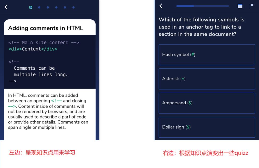 然后学完回到手机APP里,它又会针对电脑端的学习资料演变出很多个quiz,这些quiz不是网页里知识点的简单重复,而是如前文所介绍的,将知识点变形,变换出近似知识点,或者变化某个部分,从多个角度多个层面测试。