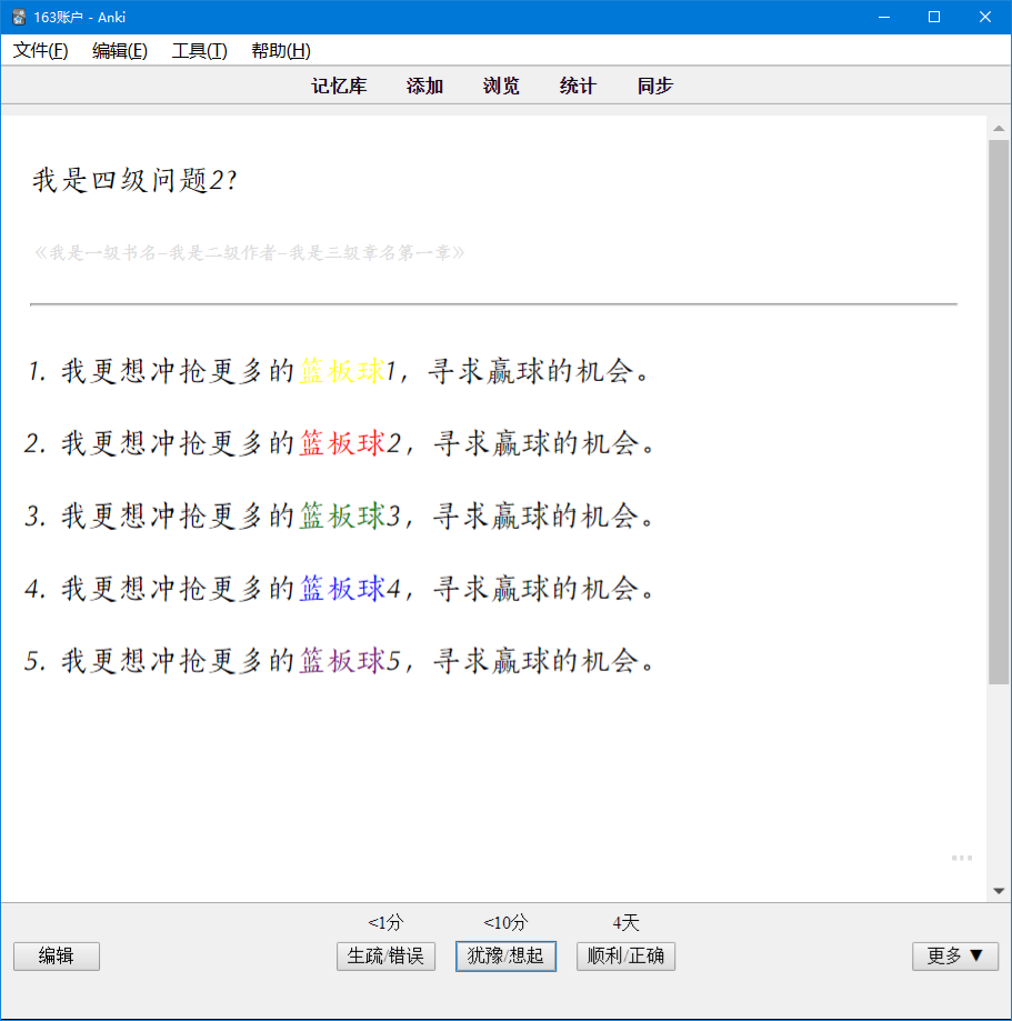 但是,通过与幕布的结合,按照一定的格式要求记录,在幕布里记录的笔记,可以在十几秒内转入ANKI复习。幕布里目前所有的格式(如加粗、斜体、下划线、局部颜色标注、图片、超链接等)都可以以特定的样式呈现在ANKI里。