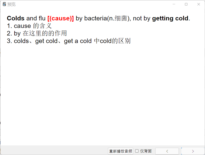 我比较喜欢放在语境里去测试,所以会找一些例句做成选择题卡片,然后改写一些典型错误和正确用法放在一起。