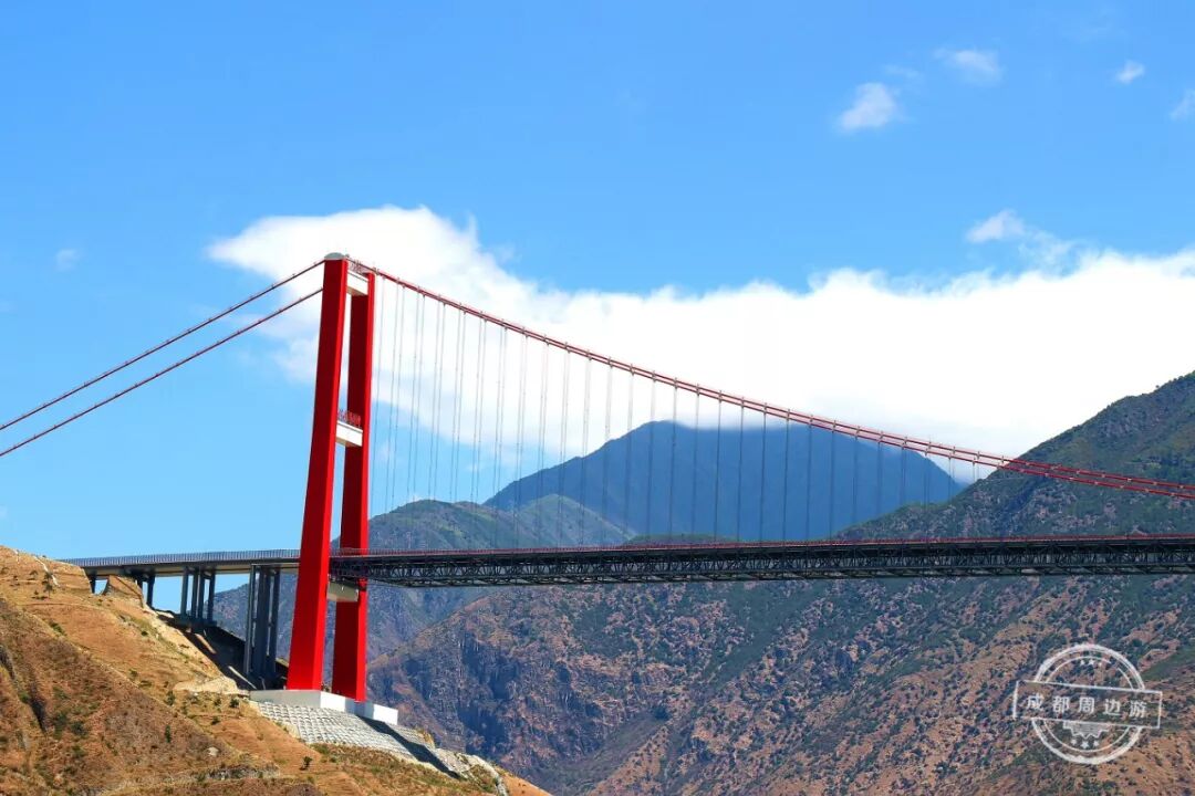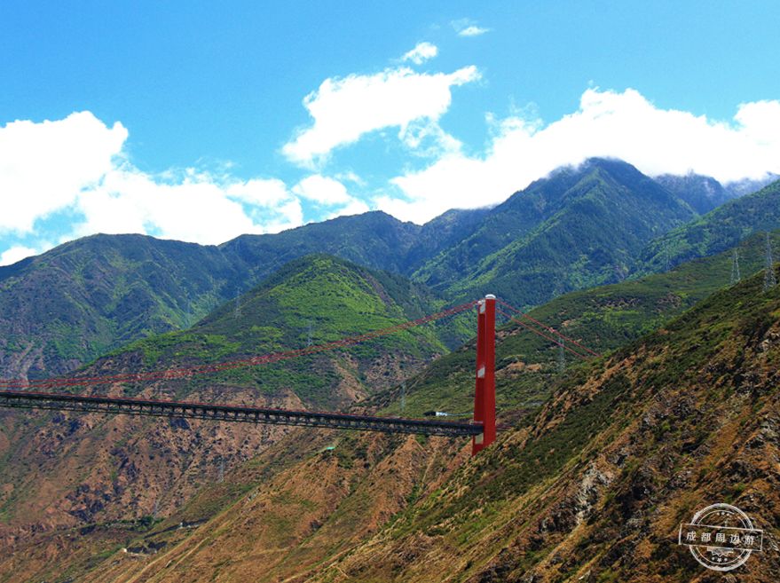 川藏第一桥连接山和天空,挺拔大气,随手一拍就是一张电脑壁纸,蓝天白云红桥,就像一幅油画,美不胜收!