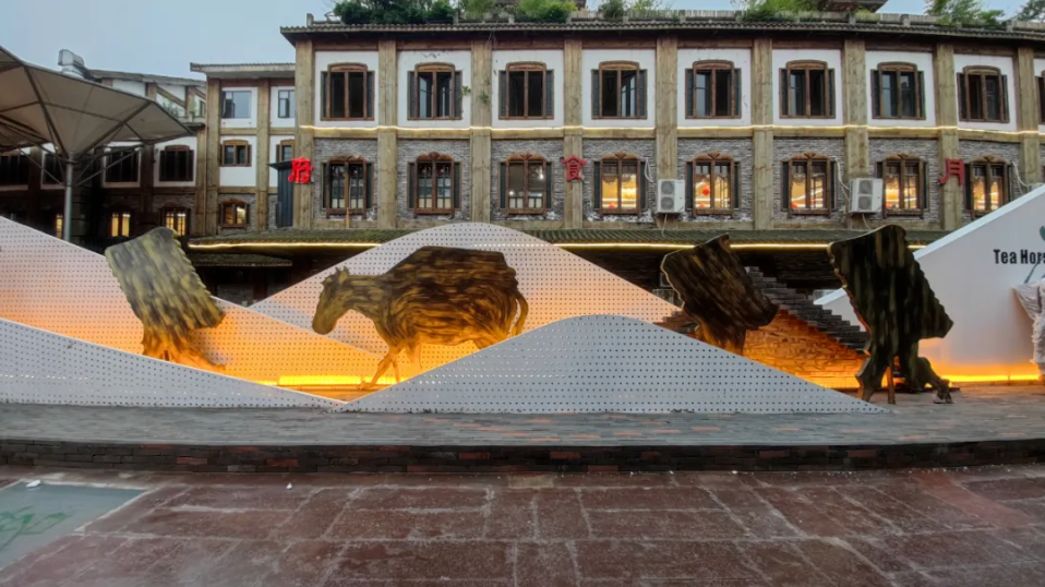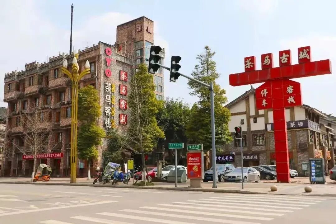 从成雅高速名山站出口出来,蒙顶山牌坊后面就是茶马古城片区。这里是川藏茶马古道的起点,现建成了具有茶文化元素的“茶里”特色街区。