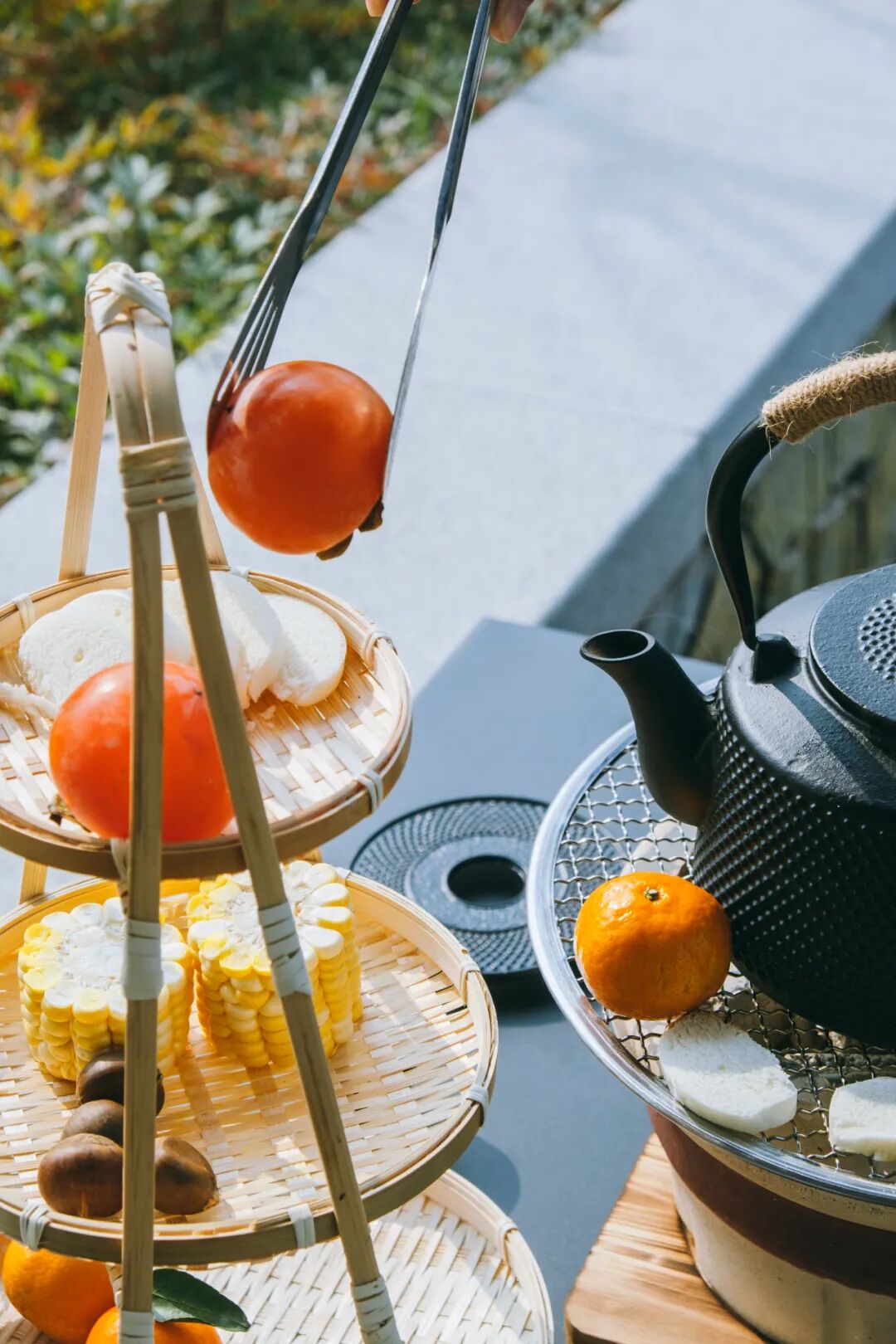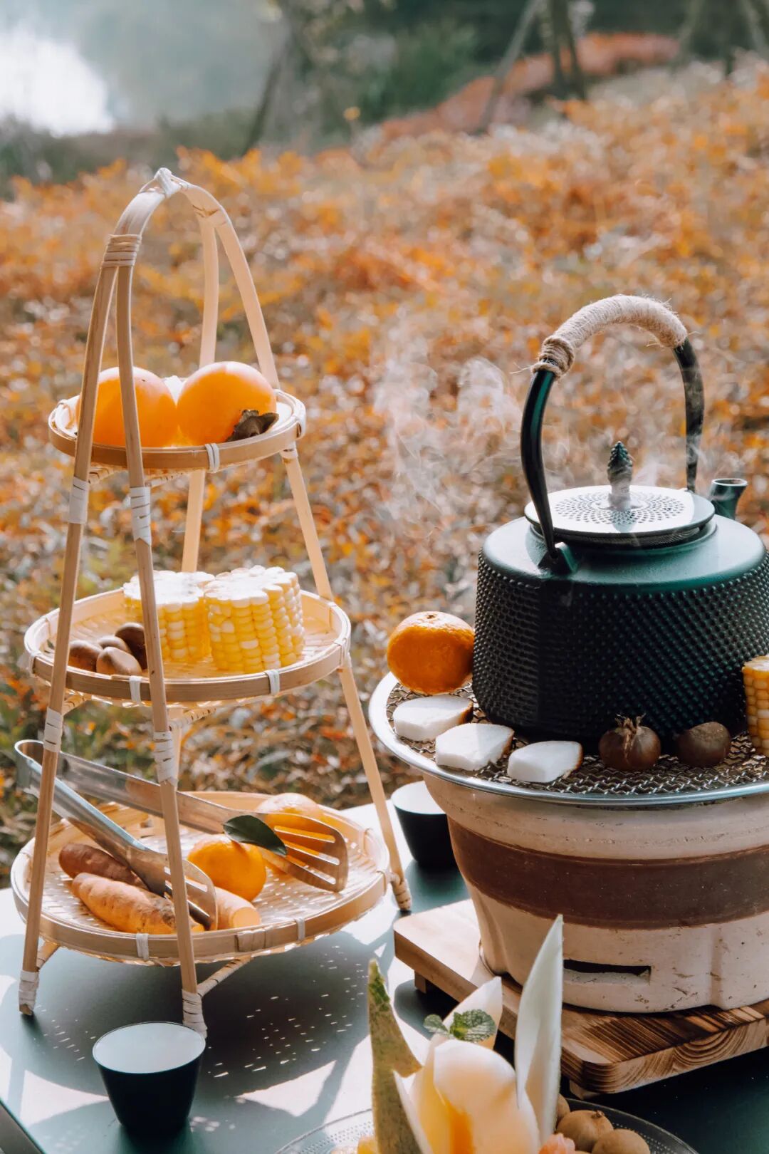 柿子、玉米、红薯、橘子、板栗...10+品种菜品轮番上阵,一边烤着火一边喝着热茶,空气中弥漫着红薯板栗的香甜,围着炉子静坐一下午完全没问题!