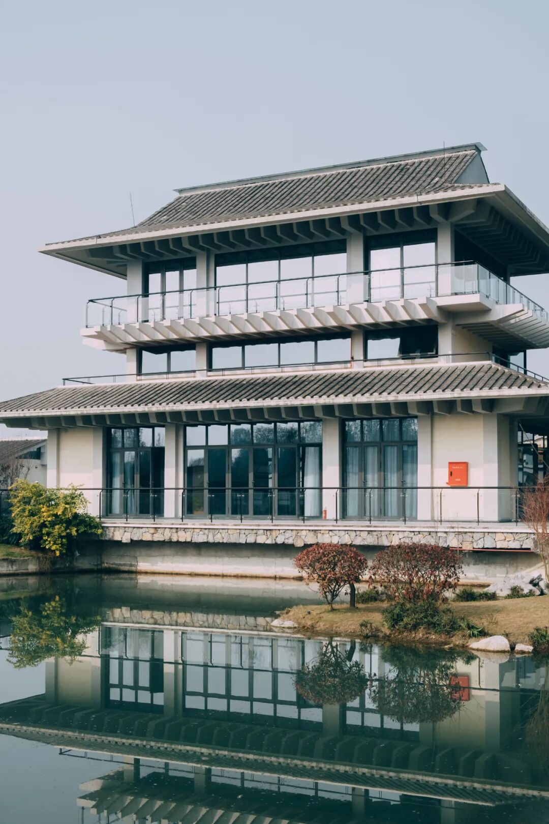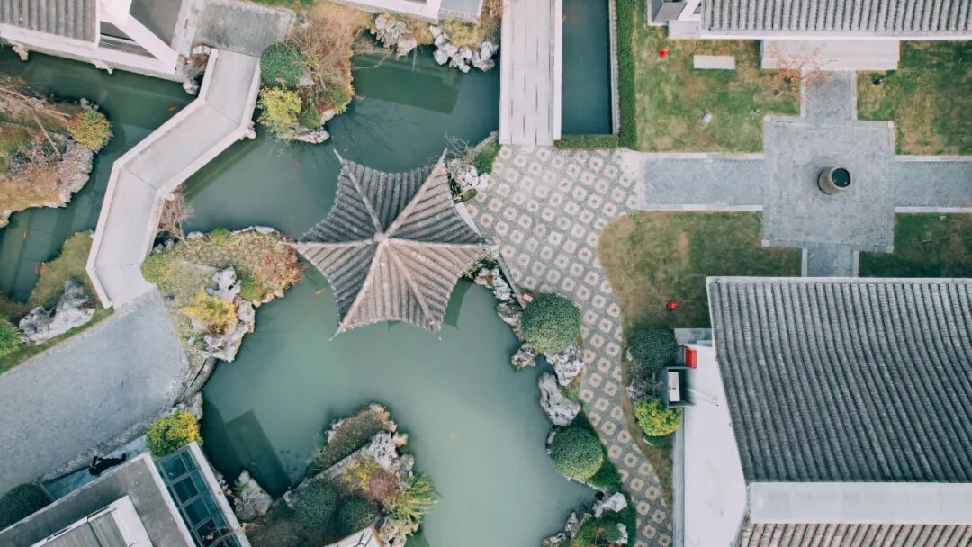 整个酒店亭、阁、院、水、廊、桥相映成景,白墙黑瓦树影斑斑与水下涟漪相映成趣,瞬间令人沉浸在这片“江南水乡”之中。