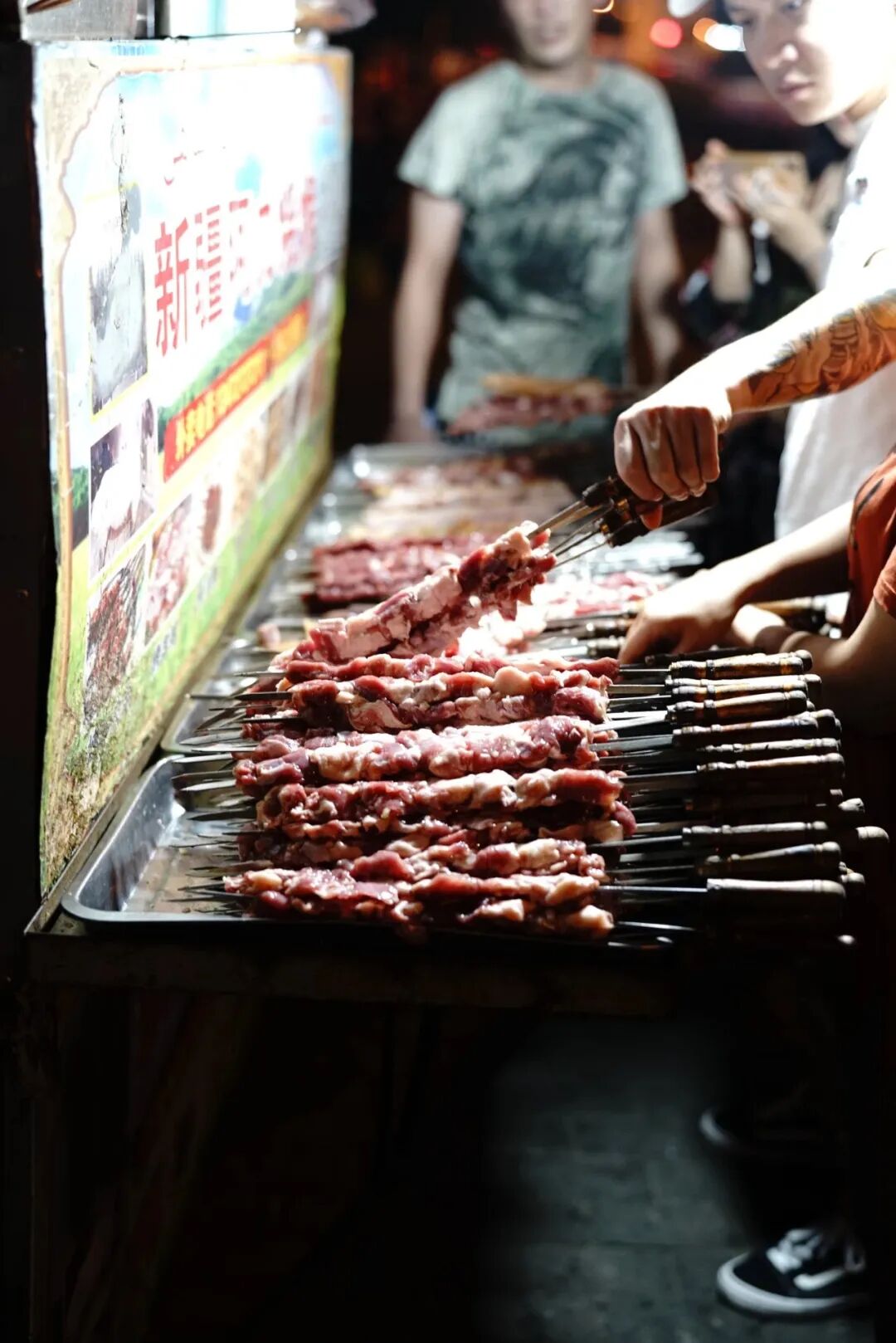 这家的羊肉是按斤卖的。现切现串,一斤68块。只见老板娘掏出锋利的小刀,一割就是一大块,肥瘦相间,一斤多一点,刷刷切成比食指还厚的大块,串在铁签上。紧接而来的就是羊油混合着孜然的香气——弥漫在空气中,吸引了新一波人的驻足。这宣传效应,强过任何付费广告。其实中国人跟食物的关系一直都还不错:无论是路边宰羊还是肥肠猪脑,中国人都能物尽其用,吃得欢愉,从食材角度来说,几乎没有什么鄙视链条。![]()