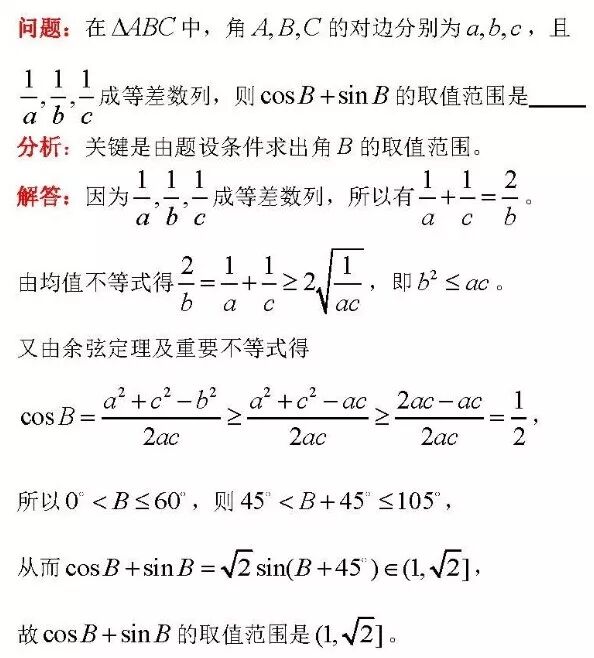 点评:本题是一道将余弦定理、三角函数、等差数列和不等式等知识交汇的综合小题,本解法巧用均值定理和重要不等式求出角B的取值范围,从而求出三角函数的取值范围。解法简单,自然流畅。