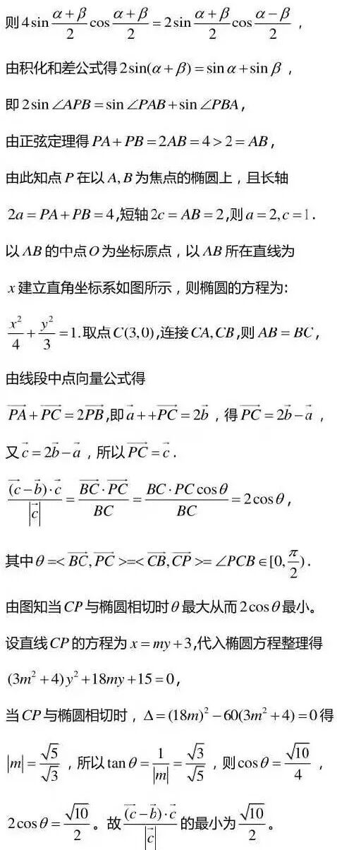 点评:本题是一道以向量为载体的最值问题,向量集数与形于一身,是数形结合的良好素材。本解法根据向量的有关知识充分利用向量的几何特征,将问题转化为直观的几何图形来解决。本解法综合性很强,综合运用了向量、三角、解析几何等有关知识,是一道考查分析问题和解决问题能力,考查数学综合素质和数学素养的难得好题。