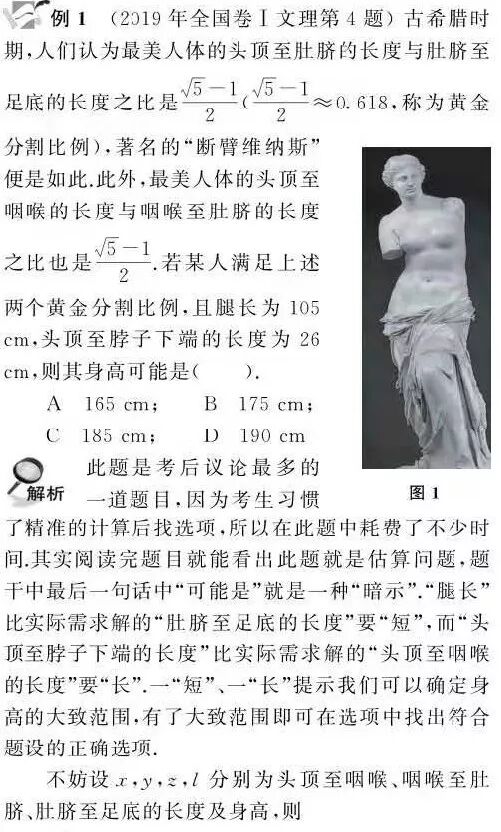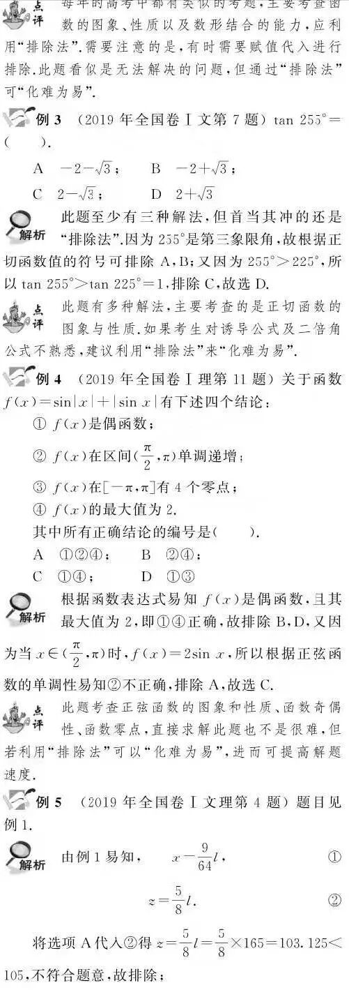 今年高考结束后,考生普遍反映全国卷Ⅰ数学试题很难! 与去年比较,全国卷Ⅰ数学试题难度确实有所提高,但也不至于说很难.根据调查,考生普遍反映,部分选择题难度大,导致后期没有足够的解题时间.从中可以看出,考生并没有完全掌握解答选择题时“化难为易”的解题方法.下面从2019年全国卷Ⅰ数学部分选择题的解题思路出发,谈谈“化难为易”的三种途径.