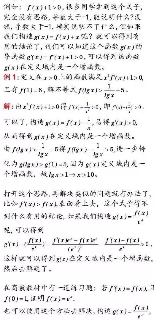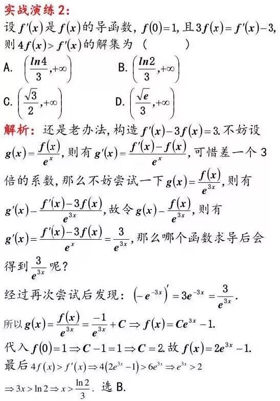 总结:这类题对学生的计算的要求的很高的,尤其是反向去寻找一个函数的导函数这个技能要求很高,对于有能力的学生,完全可以提前教学生微分方程的初步知识,这样再去解这种方程就非常容易了。