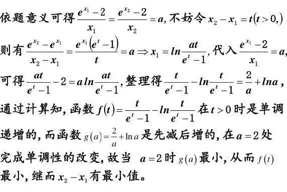 这里巧妙之处在于虽然无法解出两个零点,但可以用含有a的式子把x2-x1给表示出来,利用两个函数的单调性来确定x2-x1的最小值的位置,是值得好好学习的方法。