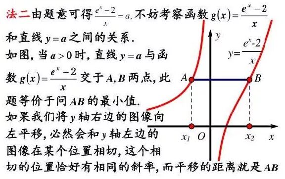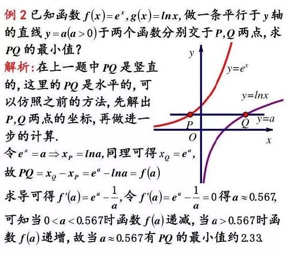 通过法二,细心的读者应该可以发现了,这类不管是竖直方向还是水平方向的两点距离最值问题,都对应于两点处横(纵)坐标相同且对应的导数值相同的这个核心要点,如果你掌握了这个方法,就能大幅度的减少运算量。
