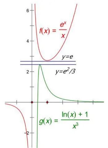 2.函数f(x)与g(x)的图像如图所示。由图像可知,当x>0时,两个函数图像凹凸反转,分别与两直线y=e和y=e2/3相切,两条平行切线形成“汉界楚河”。