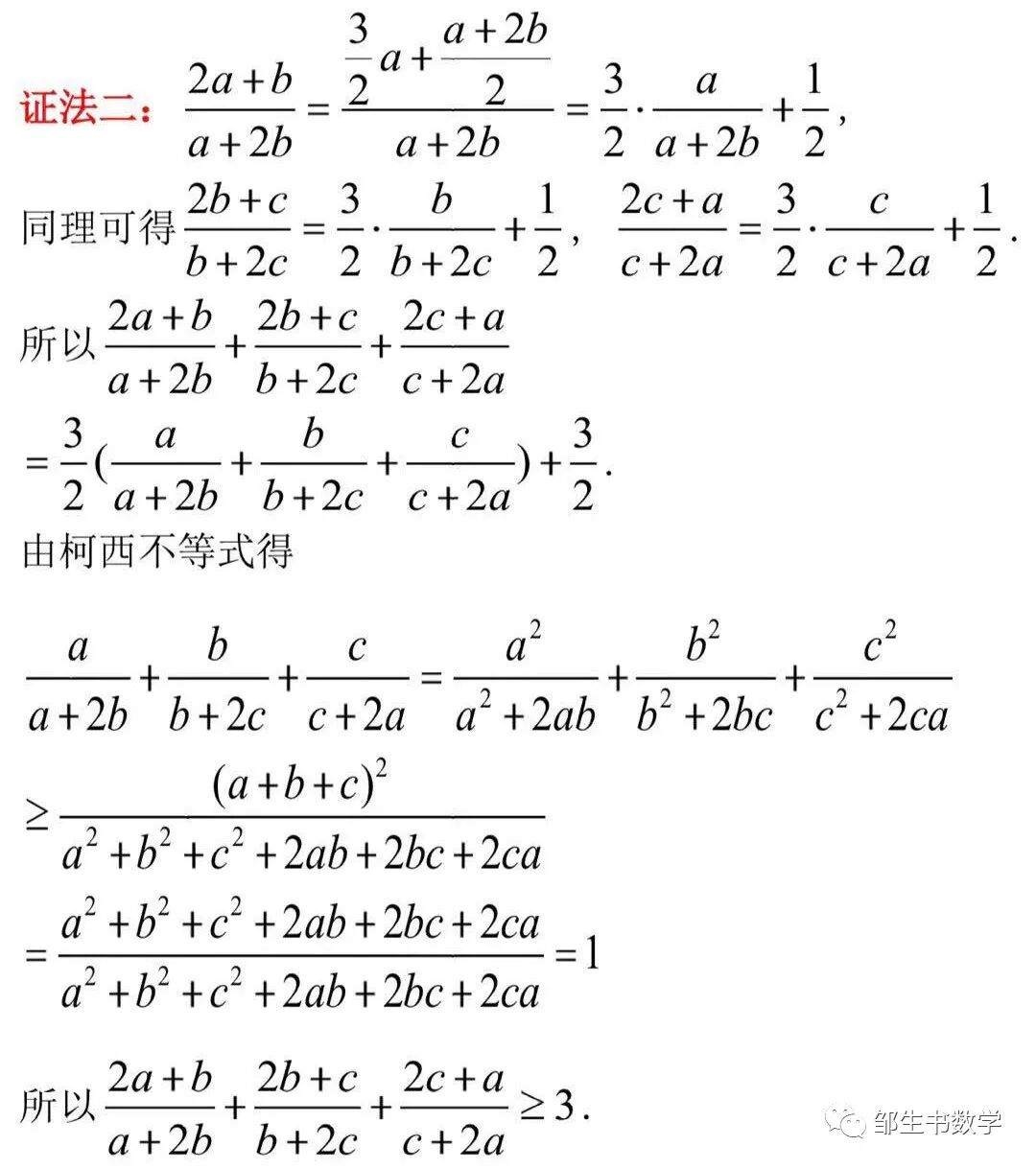 注:证法一没有直接通分,而是通过代换和巧妙变形后再通分,极大减少计算量,最后利用三元均值不等式证明结论.