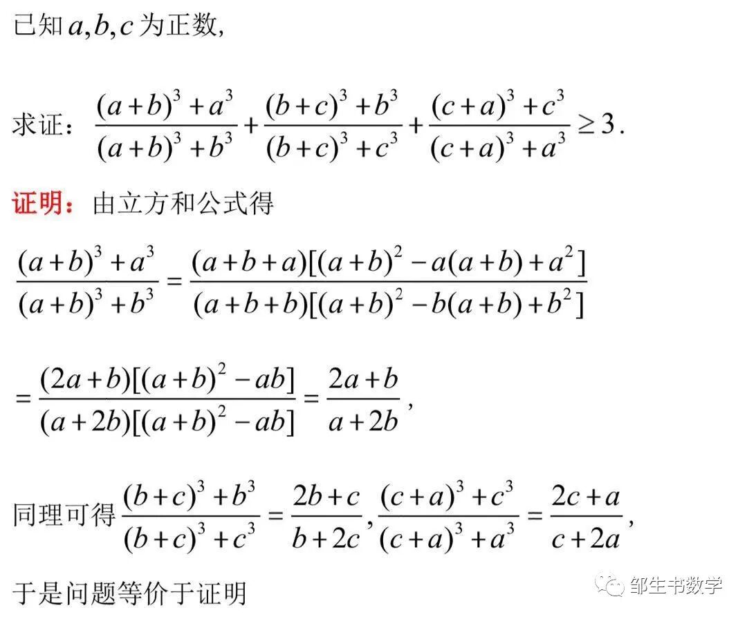 原题是选择题,非常容易选出答案,由轮换对称性猜测当a=b=c时该式取最小值3.本文就来严格证明这个结论,即证: